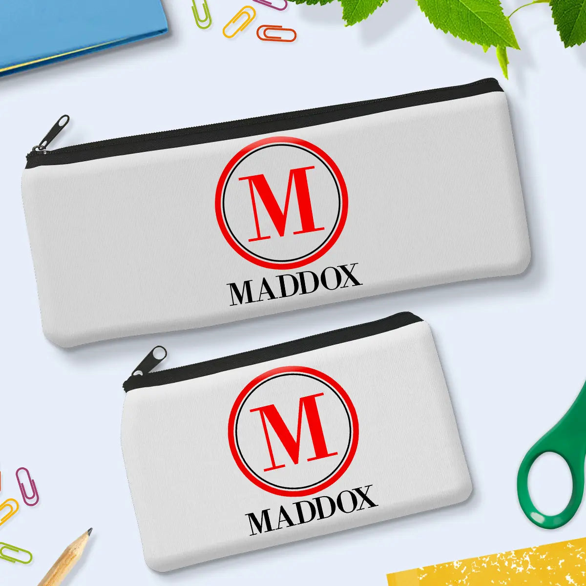 Our pencil cases come in two sizes: small or large. Design is printed on both sides. Pencil cases are made from durable neoprene material with a zip at the top.