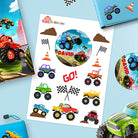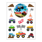 Pack includes one large personalised round sticker, 7 trucks, 3 flags, 2 witches hats, 2 rocks and 1 go word. 16 stickers in total per/sheet.
