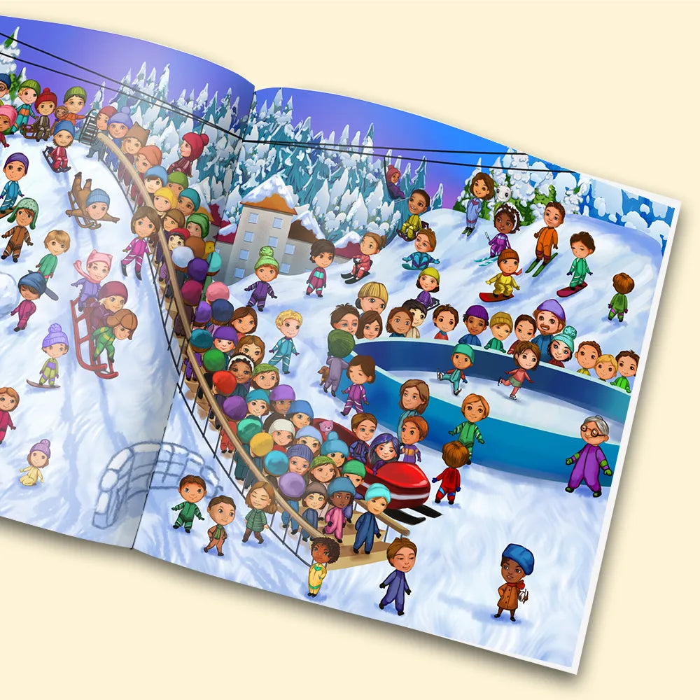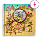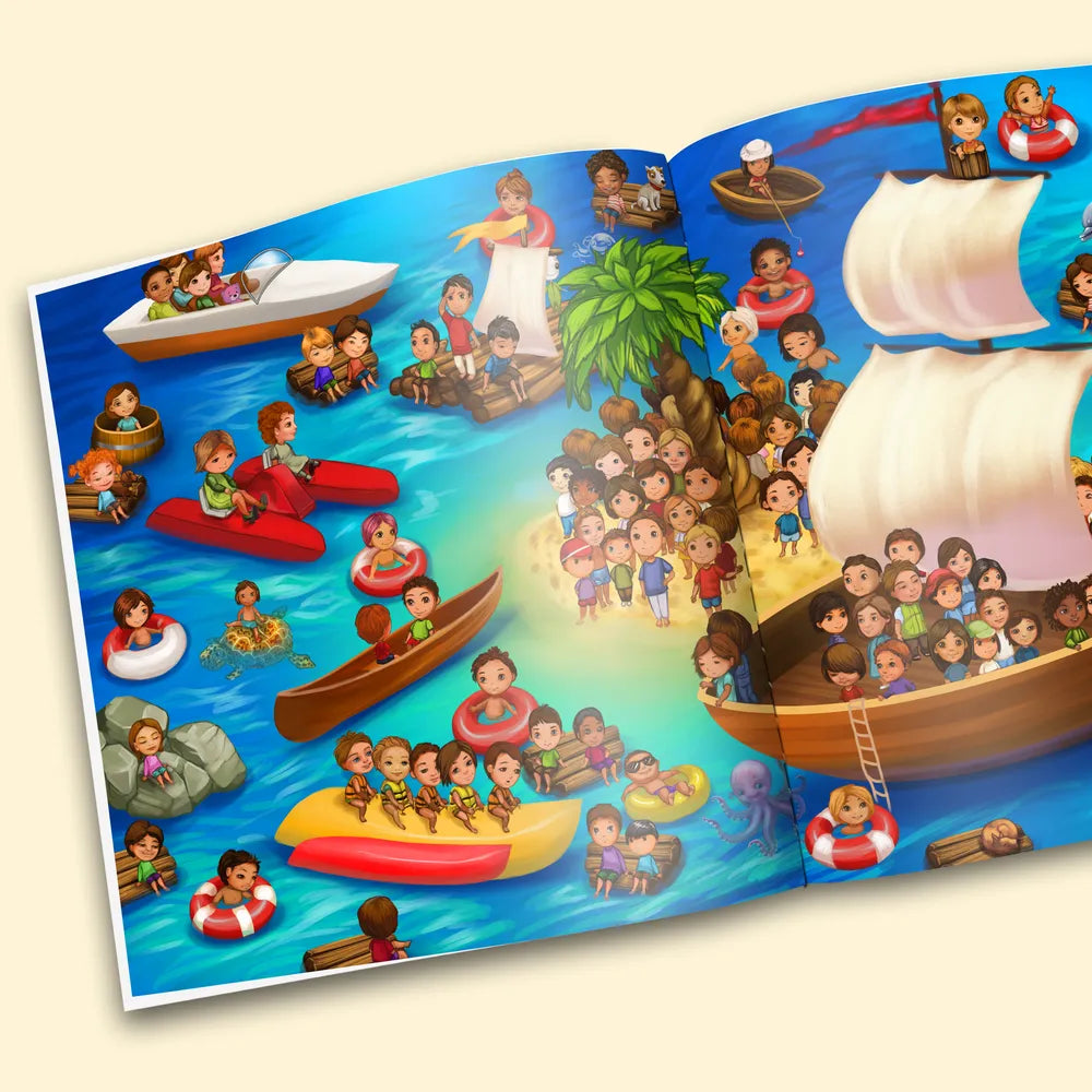 A personalised search and find book, where you are looking for yourself! Eight double page spreads where you need to find your character amongst all the other people in each location.